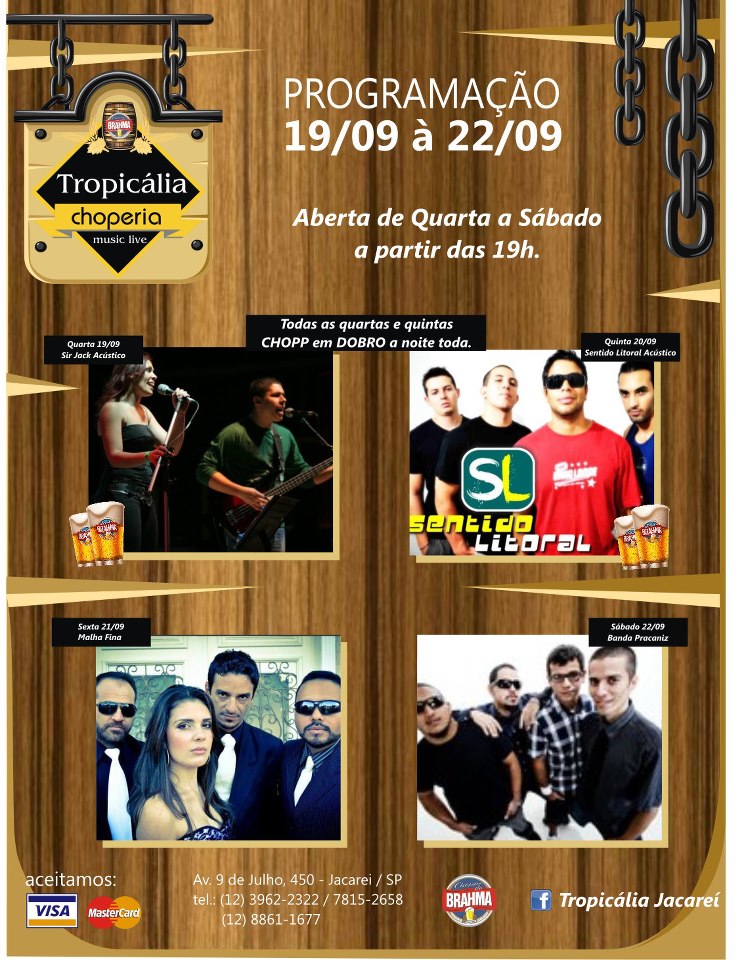 TROPICALIA CHOPPERIA - Av. 9 Julho, 450 - Jacareí ( em frente à escola Agrícula - Fapija) - (12) 3952 - 5157 - http://www.camaleaobardisco.com.br - Bar ao ar livre somado com danceteria, incluindo ambientes Live-Music, com bandas tocando ao vivo e E-music apresentando DJs. Alem disso possui um snooker bar onde conta com mesinhas e porções.