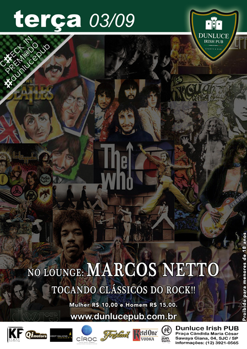 Atrações: no lounge: Marcos Netto, (classic rock). Mulher R$ 10,00 e Homem R$ 15,00. Preços sujeitos a alterações na porta. Compareça!